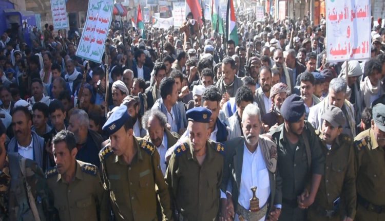 وجدد المشاركون في المسيرة تأييدهم ووقوفهم الثابت والراسخ خلف القيادة الثورية مع ابناء الشعب الفلسطيني ومقاومته الباسلة التي تسطر اروع ملاحم البطولة والفداء باسم الامة العربية والإسلامية ضد أعدائها من اليهود والامريكان ومن تحالف معهم .. موضحين في بيان مسيرتهم ان العدوان الامريكي البريطاني على اليمن لن يؤثر في موقف الشعب والقيادة اليمنية والتزامها الأخلاقي والديني والاخوي في استمرار نصرة الشعب الفلسطيني المظلوم ومواصلة العمليات العسكرية في عمق الأراضي الفلسطينية المحتلة او في البحرين الأحمر والعربي وخليج عدن ..