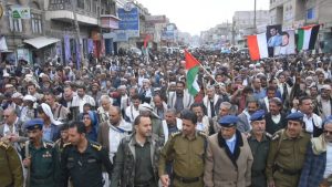 ورفع المشاركون في المسيرة التي حضرها عضوا مجلس الشورى محمد التويتي وعبدالله الفرح ، العلمين اليمني والفلسطيني مرددين الهتافات المؤكدة على أن أمريكا هي أم الإرهاب والشيطان الأكبر وصانعة الشر في العالم.