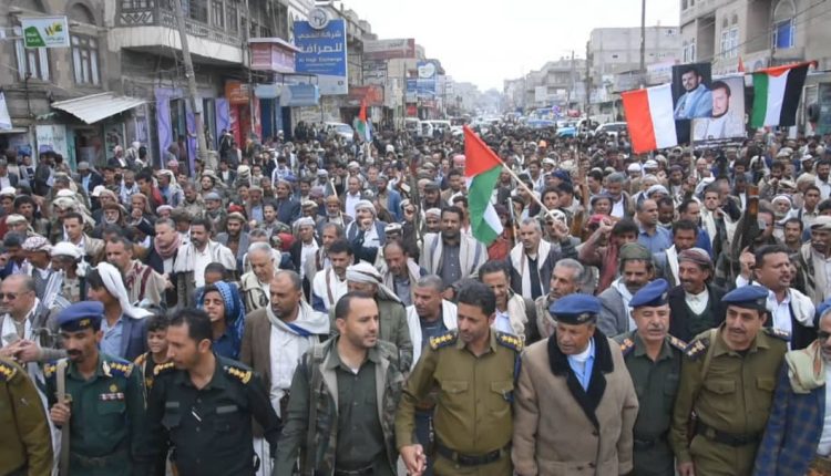 إب : مسيرة حاشدة في المربع الشمالي بعنوان ” ثابتون مع فلسطين وامريكا أم الإرهاب ” .