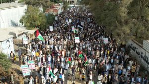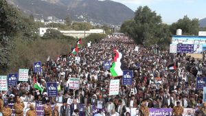 وردد المحتشدون في المسيرة الهتافات المنددة بالجرائم الصهيونية بحق أبناء غزة والدعم والمشاركة الامريكية مع الصهاينة مجددين تفويضهم للسيد القائد باتخاذ ما يلزم نصرةً وإسنادا للشعب والمقاومة الفلسطينية ..