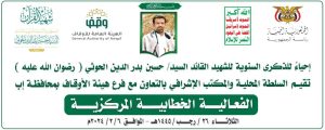 نظمت السلطة المحلية والمكتب الإشرافي وفرع الهيئة العامة للأوقاف بمحافظة إب اليوم، الفعالية الخطابية المركزية بالذكرى السنوية للشهيد القائد السيد حسين بدر الدين الحوثي (رضوان الله عليه).