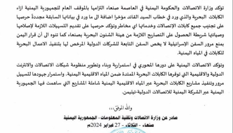 وأكدت الوزارة والحكومة اليمنية في العاصمة صنعاء التزامها بالموقف العام للجمهورية اليمنية إزاء الكابلات البحرية والذي ورد في خطاب السيد القائد مؤخرا إضافة على ما ورد في بياناتها السابقة، مجددة حرصها على تجنيب جميع كابلات الاتصالات وخدماتها أي مخاطر، وتؤكد حرصها على تقديم التسهيلات اللازمة لإصلاحها وصيانتها شريطة الحصول على التصاريح اللازمة من هيئة الشؤون البحرية بصنعاء.