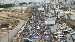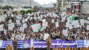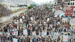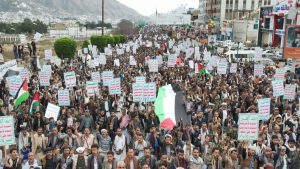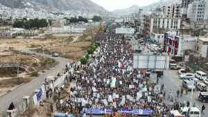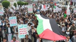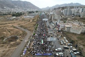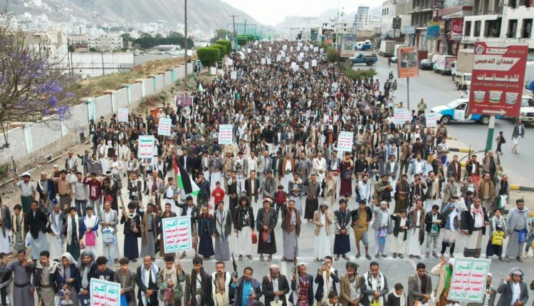 وأكد المشاركون في المسيرة جهوزيتهم لخوض معركة “الفتح الموعود والجهاد المقدس”، نصرة للشعب الفلسطيني في غزة والأراضي المحتلة.. مجددين في بيان مسيرتهم التأييد لعمليات القوات المسلحة عبر القوات البحرية والقوة الصاروخية وسلاح الجو المسير في استهداف عمق العدو الصهيوني ومنع مرور السفن الإسرائيلية والأمريكية والبريطانية من البحرين الأحمر والعربي وخليج عدن.
