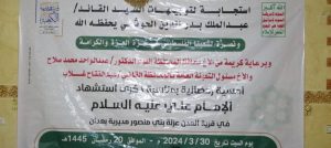 أقيمت مساء اليوم في عزلة بني منصور بمديرية بعدان محافظة إب ، أمسية رمضانية في ذكرى استشهاد الإمام علي وتحت شعار ” فزتُ ورب الكعبة ” ..