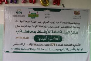 ومن جانبه أوضح نائب مدير عام مكتب  اﻷوقاف بالمحافظة صدام العميسي ، أن توزيع كسوة العيد للأيتام مشروعٌ دأب عليه فرع الهيئة ضمن مشاريع الإحسان التي تنفذها الأوقاف تنفيذا لوصايا الواقفين  .. مؤكدا  أن تنفيذ هذا المشروع يأتي بعد أن تم صرف الكفالة الشهرية لدور الأيتام واليتيمات في مركز المحافظة بمبلغ ثلاثة ملايين ريال .. لافتا إلى أن المكتب سيدشن خلال اﻷيام القادمة عددا من المشاريع النوعية التي تستهدف مساعدة الفئات الفقيرة والمستضعفة.