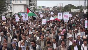 وصدح المحتشدون باصواتهم العالية مرددين هتافات النصرة والإسناد للقضية الفلسطينية في يوم القدس العالمي ..
