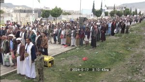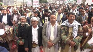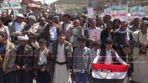 وعبر المحتشدون عن الفخر والاعتزاز بمواقف قائد الثورة، التي رفعت رؤوس اليمنيين، وبيضت وجوههم، مؤكدا الاستعداد التام لتنفيذ أي توجيهات لخوض المعركة في البر والبحر، والسهل والجبل، وفي الشدة والرخاء ولن يتخلف رجل واحد .. مشيدين في بيان مسيرتهم بالعمليات البطولية الأسطورية للمجاهدين في غزة وكل فلسطين ولجبهات الإسناد في لبنان والعراق وكذا للقوات المسلحة اليمنية في مرحلتها الرابعة التي وصلت إلى البحر الأبيض المتوسط شمالا والمحيط الهندي جنوباً.