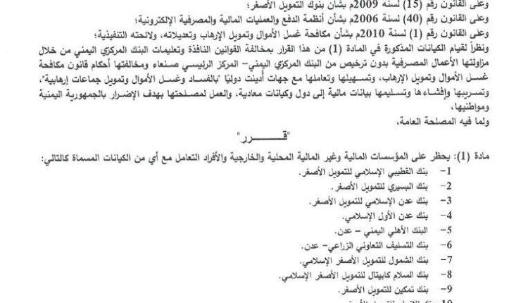 وعلى القانون رقم (15) لسنة 2009م بشأن بنوك التمويل الأصغر؛ وعلى القانون رقم (40) لسنة 2006م بشأن أنظمة الدفع والعمليات المالية والمصرفية الإلكترونية وعلى القانون رقم (1) لسنة 2010م بشأن مكافحة غسل الأموال وتمويل الإرهاب وتعديلاته، ولائحته التنفيذية؛ ونظراً لقيام الكيانات المذكورة في المادة (1) من هذا القرار بمخالفة القوانين النافذة وتعليمات البنك المركزي اليمني من خلال مزاولتها الأعمال المصرفية بدون ترخيص من البنك المركزي اليمني المركز الرئيسي صنعاء ومخالفتها أحكام قانون مكافحة غسل الأموال وتمويل الإرهاب وتسهيلها وتعاملها مع جهات أدينت دوليًا” “بالفساد” وغسل الأموال وتمويل جماعات إرهابية، وتسريبها وإفشاء ها وتسليمها بيانات مالية إلى دول وكيانات معادية، والعمل لمصلحتها بهدف الإضرار بالجمهورية اليمنية