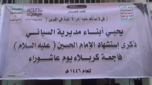 ،،، كما أقيمت اليوم في مديرية حبيش فعالية خطابية بمناسبة ذكرى عاشوراء ذكرى استشهاد الإمام الحسين عليه السلام 1446 هجرية .و تحت شعار ” هيهات منا الذلة ” عاشوراء ثورة ضد الطغيان .