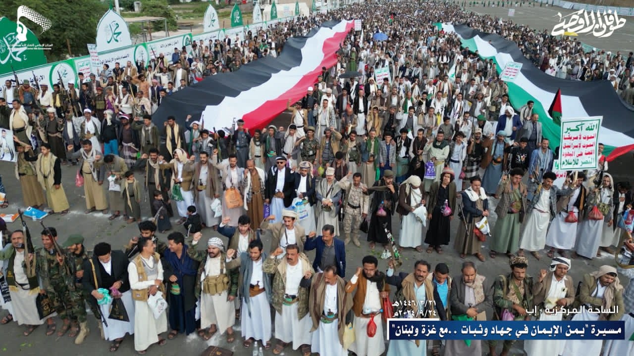 احتشد أبناء محافظة إب اليوم في 56 ساحة في مركز المحافظة والمديريات والعزل بعنوان ” يمن الايمان في جهاد وثبات مع غزة لبنان ” حيث خرجت بمركز المحافظة مسيرة جماهيرية حاشدة في ساحة الرسول الاعظم تقدمتها قيادة السلطة بالمحافظة وقيادة التعبئة العامة والقيادات العسكرية والامنية والقضائية والاكاديمية .