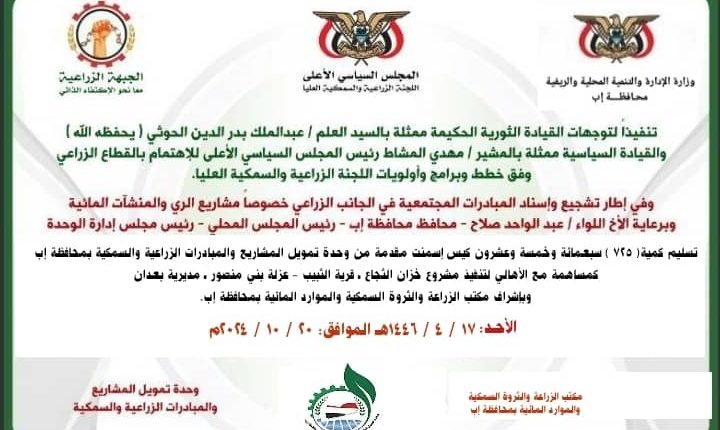 من جانبه، أشار المدير التنفيذي للوحدة، يحيى الرميشي، إلى أن هذا الدعم يأتي ضمن توجهات القيادة السياسية لتعزيز المبادرات المجتمعية وتحقيق التنمية الزراعية. وشدد على أهمية التكافل المجتمعي في إنشاء السدود وحصاد مياه الأمطار لضمان التوسع الزراعي.