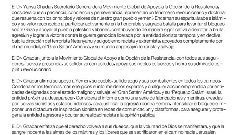 إننا ندين بأشد العبارات قرار فريق الخبراء في مجلس الأمن الدولي الذي استهدف اليمن ومؤسساته الوطنية، والذي يزيد من معاناة الشعب اليمني ويعيق جهود السلام والاستقرار في المنطقة. نؤكد أن هذا القرار لا يخدم سوى مصالح قوى العدوان، وندعو المجتمع الدولي إلى مراجعة مواقفه والوقوف مع الحق والعدالة.