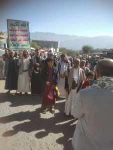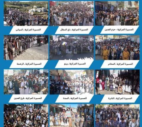 وفي ذات السياق أُقيمت في مديرية ذي السفال سبع مسيرات في مركز المديرية بمدينة القاعدة وعزل حبير والجعاشن وشوائط والدخال والوحص والسيف، ومسيرتان حاشدتان في مديرية السياني في مركز المديرية وفي ساحة الشرف .. وست مسيرات في مديرية حبيش في مركز المديرية وفي المدورة والعارضة وسوق الربوع والذراحي وبني شبيب، كما شهدت مديرية القفر اربع مسيرات حاشدة في مركز المديرية رحاب وفي ربابة وفي بني مسلم وفي بني ساوي ، اما مديرية المخادر فقد خرجت فيها ست مسيرات حاشدة في مركز المديرية وفي بني سرحة مع المعشار وفي سوق رهيش وفي عزلة الشرف وفي ممسى الخضراء والزبيدي وفي الملحمة بيت الغرباني بالسحول .. اما مديرية بعدان فقد خرجت فيها ثمان مسيرات حاشدة في مركز المديرية طبيع وفي عزل دلال والمنار وحيسان والدعيس والعذارب وبني منصور ونادب ..