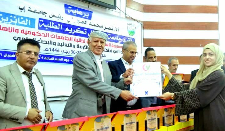نظمت جامعة إب حفلا تكريميا للفرق العلمية الحاصلة على المراكز الثلاثة الأولى في المسابقات العلمية التنافسية بمجال الطب والهندسة التي أقامتها وزارة التربية والتعليم العالي والبحث العلمي بمشاركة 25 جامعة حكومية وأهلية على مستوى الجمهورية .