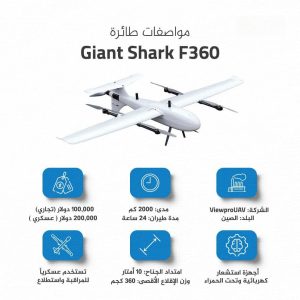 طائرة “Giant Shark F360” هي مركبة جوية مسيّرة (UAV) كهربائية بالكامل من نوع الإقلاع والهبوط العمودي (VTOL) ذات جناح ثابت، صممتها شركة Viewpro الصينية. تتميز بقدرتها على حمل حمولات ثقيلة تصل إلى 10 كيلوجرامات، مما يجعلها مناسبة لمهام الاستطلاع والمراقبة.