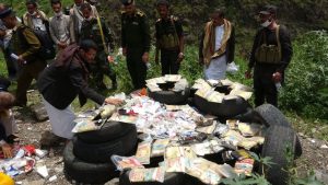 قامت النيابة العامة بمحافظة إب اليوم بإتلاف كمية كبيرة من المخدرات المضبوطة ” حبوب وحشيش ” ، بعد صدور أوامر قضائية بإتلافها ، وذلك بالتزامن مع اليوم العالمي لمكافحة المخدرات ..