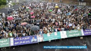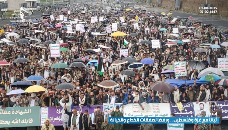 وأكد بيان صادر عن مسيرات المحافظة أنه واستشعاراً للمسؤولية الدينية والإنسانية والأخلاقية، يستمر الشعب اليمني في خروجه الأسبوعي في مسيرات مليونية جهاداً في سبيل لله وابتغاءً لرضاه، نصرة لغزة وكل فلسطين في مواجهة الطغاة والمستكبرين، ورفضا لصفقات الخداع والخيانة.