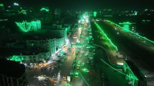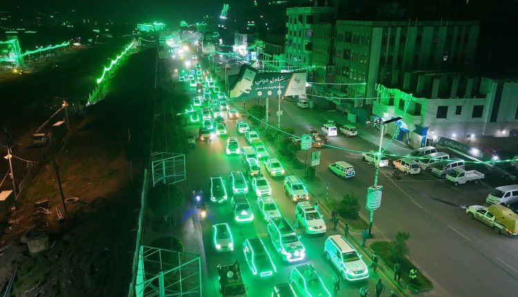 مسيرة مركزية حاشدة للسيارات الضوئية في مدينة إب بمناسبة مولد النبي الخاتم .