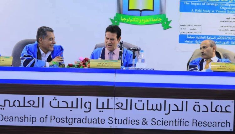 وتكونت لجنة المناقشة من أ.د. عبده العامري أستاذ إدارة الأعمال بجامعة العلوم والتكنولوجيا المحكم الداخلي رئيساً و أ.د. جمال درهم أستاذ إدارة الأعمال بجامعة العلوم والتكنولوجيا المشرف على الباحث عضواً و أ. د فضل المحمودي المحكم الخارجي عضواً.