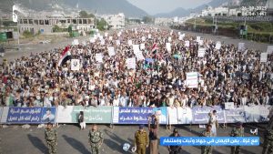 وأكدت هتافات المشاركين في المسيرات أن اليمن سيبقى في خط المواجهة حتى يتحقق وعد الله بالنصر، وأن القدس ستظل بوصلة الأحرار وقبلة الجهاد.. مشيرين إلى أن تحرير الأراضي العربية المغتصبة واجب على كل حر شريف.