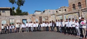 نظم طلاب مجمع الإمام البخاري في منطقة اليهاري بمديرية ريف إب اليوم، وقفة ومسير طلابي لعدد 256 طالباً من خريجي دورات طوفان الأقصى.
