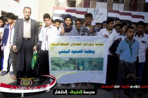 إب  نيوز 14-1-2017 :- نظم عدد من مدارس مديرية الظهار محافظة إب برعاية مكتب التربية والتعليم بالمحافظة اليوم وقفات إحتجاجية للتنديد بجرائم العدوان السعودي الأمريكي وفعالية توعوية لمواجهة أكاذيب وأباطيل وسائل وقنوات العدوان الاعلامية.
