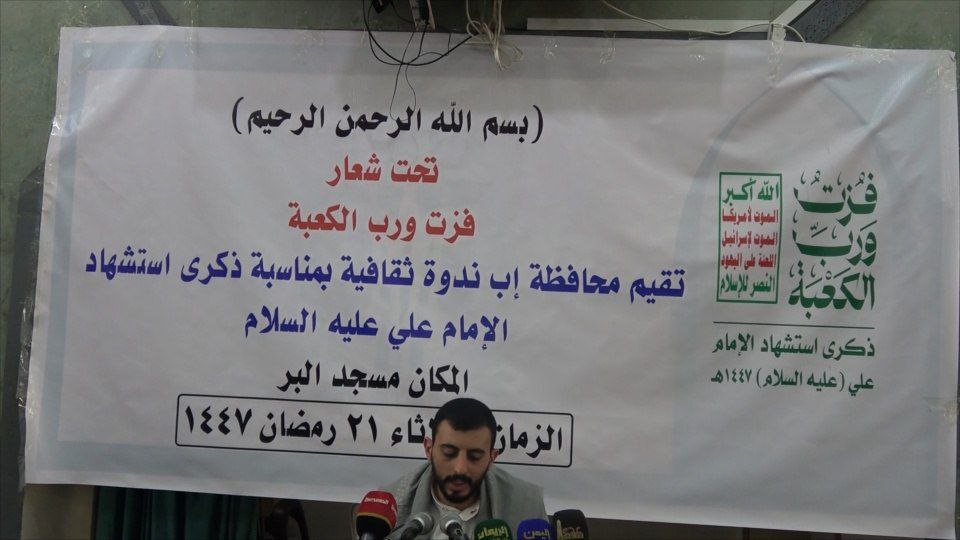 نظمّت السلطة المحلية والتعبئة العامة بمحافظة إب، اليوم، ندوة ثقافية وخطابية ، إحياءً لذكرى استشهاد الإمام علي عليه السلام، و تحت شعار “فزت ورب الكعبة”.