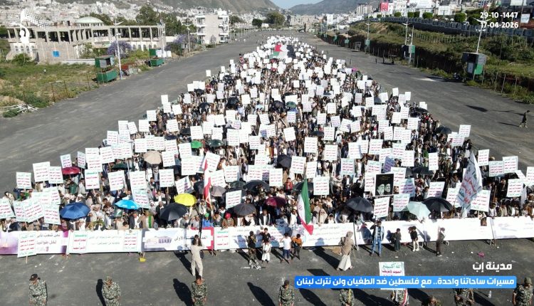 وأكد بيان ساحات إب، أن الخروج الجماهيري، يأتي انطلاقًا من المسؤولية الدينية والإنسانية والأخلاقية، وتجسيدًا لموقف ثابت في مواجهة المخططات الصهيونية، وفي مقدمتها ما يسمى بـ”إسرائيل الكبرى”.. مجددين التأكيد على نصرة قضايا الأمة، وعلى رأسها القضية الفلسطينية والدفاع عن المسجد الأقصى، ومساندة الشعبين الفلسطيني واللبناني.