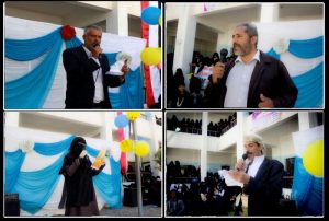 وفي الحفل الذي تضمن العديد من الفقرات الانشادية والشعرية القى نائب مدير عام مكتب التربية بمحافظة اب محمد لطف المتوكل كلمة اشاد فيها بصمود الجانب التربوي واستمرار نشاطه رغم العدوان وحصاره الذي تسبب في قطع رواتب الموظفين ومنهم المعلمين وبالرغم من ذلك استمرت العملية التعليمية وتفوق الكثير من الطلاب برغم الوضع الذي تمر به البلاد . مشيدا بمدرسة سناء ادارة ومعلمين على دورهم وجهودهم التي اثمرت تفوق الكثير من الطالبات . داعيا الى استمرار العملية النعليمية والمزيد من التحمل والصمود حتى اكتمال العام الدراسي وانتهاء الاختبارات النهائية التي تقررت في الثاني والعشرين من الشهر الجاري وحتى لا تضييع سنة دراسة على الطلاب والطالبات .