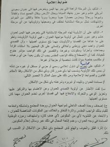 7- أي قضايا خاصة أو تباينات أو إختلافات في وجهات النظر بين المكونات المناهضة للعدوان فإن مكان تناولها ومعالجتها هو في اللقاءات والإجتماعات بين القيادات وليس في وسائل الإعلام والتواصل الإجتماعي.
