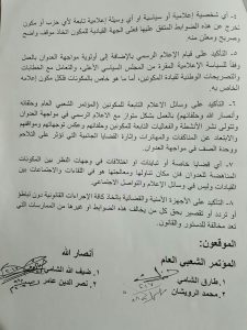 4 – أي شخصية إعلامية أو سياسية أو أي وسيلة إعلامية تابعة لأي حزب أو مكون تخرج عن هذه الضوابط المتفق عليها فعلى الجهة القيادية للمكون إتخاذ موقف واضح وصريح ومعلن منه .