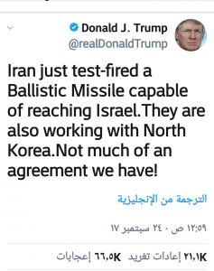 وقال ترامب في تغريدة على تويتر إن “إيران إختبرت صاروخاً بالستياً قادراً على بلوغ إسرائيل. إنهم يعملون مع كوريا الشمالية. وعملياً ليس هناك اتفاق”.