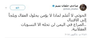 جاء ذلك في تغريدة رصدها “موقع متابعات” بصفحته على “تويتر” : حيث قال خلفان “الحوثي لا أعلم لماذا لا يؤمن بحلول العقال ويلجأ إلى الاقتتال.. الصراع في اليمن لن تحله الا التسويات العقلانية.”