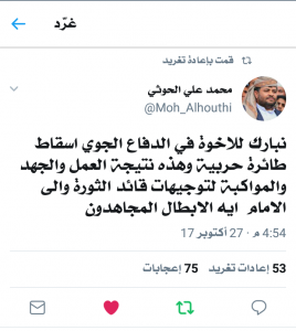وبارك “محمد علي الحوثي” -رئيس اللجنة الثورية سابقاً- في صفحته على موقع التواصل تويتر وقال: “نبارك للاخوة في الدفاع الجوي اسقاط طائرة حربية وهذه نتيجة العمل والجهد والمواكبة لتوجيهات قائد الثورة وإلى الامام أيه الابطال المجاهدون”.