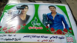 شيع اليوم بمحافظة إب جثمان الشهيد الاعلامي الزميل عبدالله عبدالفتاح المنتصر مصور قناة الساحات الفضائية والمخرج الاذاعي بإذاعة إب في موكب جنائزي مهيب انطلق من مستشفى الثورة العام بمركز المحافظة الى منطقة الشهيد بمديرية جبلة قرية منازل بردان .
