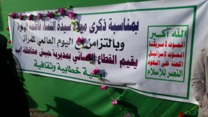 إب / نيوز24جمادي ثاني1439هـ الموافق2018/3/12 :- أقامت الهيئة النسائية الثقافية في مديرية حبيش محافظة إب وبالتزامن مع اليوم العالمي للمرأة أمسية ثقافية وخطابية إحياءا لذكرى ميلاد سيدة نساء العالمين فاطمة الزهراء .