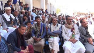 وكان اعضاء الاحزاب والمكونات الزائرة للمحافظة والمكون من الدكتور حزام الاسد عضو المجلس السياسي لانصار الله وعبدالحميد الحنش الناطق الرسمي لاحزاب التحالف الوطني وعارف العامري امين سر جبهة التحرير ومحمد الحميري عضو الهيئة العامة لحزب السلم السلفي قد القوا كلمات اشاروا في مجملها إلى أن العدوان يسعى وبكل ما يستطيع إلئ التصعيد في كافة الجبهات والمجالات وينبغي أن يقابل تصعيد العدوان بتصعيد أكبر من قبل ابناء هذا الشعب في هذه المعركة المصيرية الهامة ؛ وتحدثوا عن ما يعانية ابناء المحافظات الجنوبية المحتلة وتعز من امتهان واقلاق لامنهم وسكينتهم من قبل قوى العدوان ووصل الامر الى انتهاك الاعراض .داعين ابناء المديريات الثلاث الى المزيد من الصمود والتلاحم ورفد الجبهات بالمال والرجال والإتجاه خلف القيادة السياسية لبناء هذا الوطن ومؤسساته.