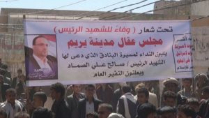 وفي الوقفة التي جابت الشارع العام بمركز المدينة تحت شعار ( يد تبني ويد تحمي ) اكد المشاركون أن اغتيال الرئيس الصماد يحتم على الجميع بذل قصارى جهودهم واستشعار المسؤولية امام الله وامام هذا الوطن الذي تسعى قوى العدوان إلى تدميره وتقسيمه ونهب ثرواته والعمل بكل جد من اجل التصدي لهذا العدوان الغاشم . موضحين في بيان مسيرتهم أن التحشيد للجبهات وتعزيز عوامل الصمود والثبات والمواجهة لهذا العدوان هي أعظم صور الوفاء لهذا الرئيس الانسان الذي قدم روحه فداء للوطن .