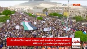 ورفع المشاركون في المسيرة الأعلام فلسطينية .. مؤكدين أن القدس قضية اليمن الأولى ووقوف الشعب اليمني مع الشعب الفلسطيني ورفضه لتهويد القدس وقرارات الإدارة الأمريكية بنقل السفارة الأمريكية إليها، وتأكيداً على عروبية القدس وفلسطين.