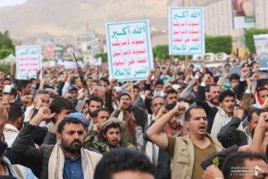 وردد المشاركون في المسيرة الهتافات المنددة بالمواقف الأمريكية والأنظمة العميلة إزاء القضية الفلسطينية، وأكدت الحشود الجماهيرية موقف الشعب اليمني الرافض والمناهض للصهاينة والمشروع الأمريكي.