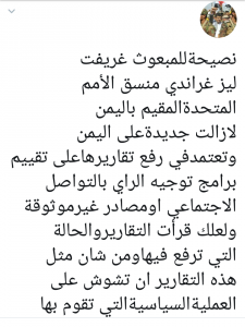 وقال الحوثي في تغريدة له على حسابة في تويتر يوم أمس ناصحا للمبعوث غريفت أن: “ليز غراندي منسق الأمم المتحدة المقيم باليمن لازالت جديدة على اليمن”.. مؤكدا أنها تعتمد في رفع تقاريرها على تقييم برامج توجيه الراي بالتواصل الاجتماعي أو مصادر غير موثوقة.