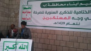 إب نيوز28شوال1439هـ الموافق2018/7/12 :- اقيم اليوم بمحافظة إب مهرجان خطابي وثقافي للذكرى السنوية للصرخة .