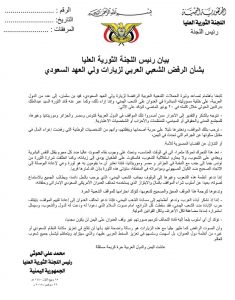 هأم : بيان رئيس اللجنة الثورية العليا بشأن الرفض الشعبي العربي لزيارات ولي العهد السعودي (نص البيان)
