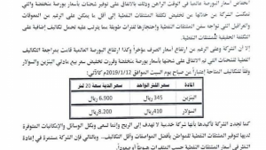 وحسب وثيقة رسمية ، فقد أقرت شركة النفط اليمنية تخفيض سعر اللتر الواحد من مادة البنزين من (370) ريال، إلى (345) ريال، وهو ما يعني انخفاض سعر جالون البنزين سعة 20 لتراً من 7400 ريال، إلى 6900 ريال، وذلك اعتباراً من صباح يوم السبت القادم الموافق 12 يناير الحالي.