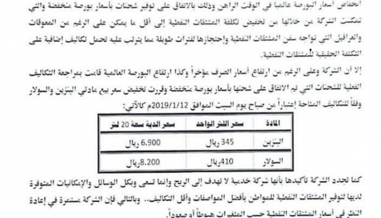 وجددت تأكيدها بأنها «شركة خدمية لا تهدف إلى الربح وإنما تسعى وبكل الوسائل المتوفرة لديها لتوفير المشتقات النفطية للمواطن بأفضل المواصفات وأقل التكاليف«، واعدةَ بـ«الاستمرار في إعادة النظر في أسعار المشتقات النفطية حسب المتغيرات هبوطاً وصعوداً»