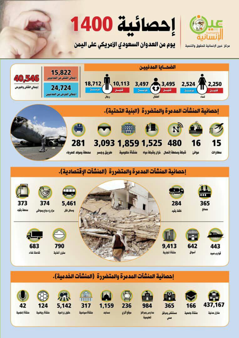 كشَفَ مركزُ عين الانسانية للحقوق والتنمية عن استشهاد وإصابة 40 ألفاً و546 مدنياً، جراء العدوان خلال 1400 يوم الحرب على اليمن.
