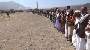 جاء ذلك خلال النكف القبلي الحاشد والمسلح الذي أقامته قبائل المديريات الثلاث حيث أكد المشاركون في بيان وقفتهم إستمرار تلاحم ووحدة صفهم ضد العدوان ورفد الجبهات بقوافل المال والرجال . مشيرين إلى قبائل مديريات القفر والمخادر وحبيش كلها يدا واحدة ضد العدوان وستكون صمام الأمان واسود ضارية ضد العدوان .