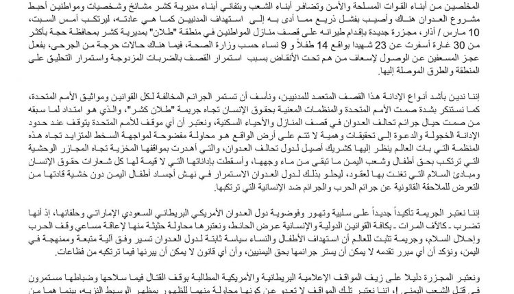 اليمن، ونؤكد أن أي مبرر تقدمه لا يمكن أن يستر جرائمها بحق اليمنيين، وأن أي قانون لا يمكن أن يبرئها فيما ترتكبه من فظاعات