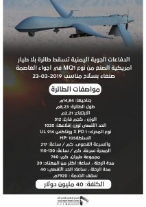 إنفوجرافيك | مواصفات الطائرة بلا طيار #MQ1 الأمريكية التي أسقطتها الدفاعات الجوية اليمنية في أجواء العاصمة صنعاء 23-03-2019