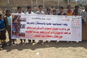 وفي الوقفة التي حضرها مدير عام المديرية خالد الكهالي وأمين عام المجلس المحلي أحمد مشرح عبر فيها المشاركون عن موقفهم الثابت و الرافض للعدوان وجرائمه واصطفافهم إلى جانب قوات الجيش واللجان الشعبية دفاعا عن المديرية. منددين في بيان وقفتهم بتلك الجريمة الجبانة لمرتزقة العدوان بحق أطفال قرية واد الردي والتي أدت إلى استشهاد الطفل ماجد الغزير خمس سنوات والشاب عبدالملك حمود جابر 16 عاما وجرح أخرين نتيجة قصف مدفعي للمرتزقة.